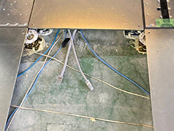 支持脚を接着剤でスラブに固定し、その上に500〜600mm角のパネルを載せて床を構成するため、床下に広い空間が生まれます。
