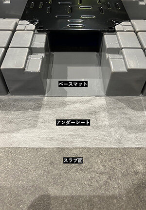 OAフロア本体を設置する前に、極薄の不織布であるアンダーシートをスラブ面に敷設します。