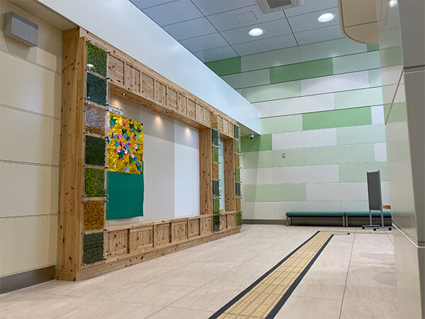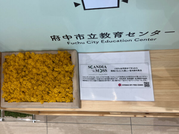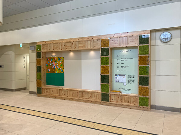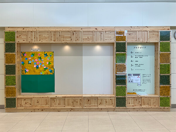 その際、1階エントランスのフロアガイドと掲示スペースの周囲の装飾にスカンディアモスを採用いただきました。