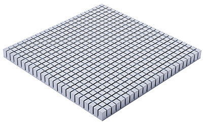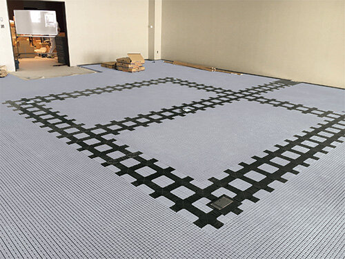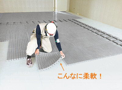 自在マットは、50mm角のブロック構造に成型した樹脂シートに、超高強度軽量コンクリートを充填して作られており、素材と構造を活かした高強度かつガタつかない安定した床下地材です。