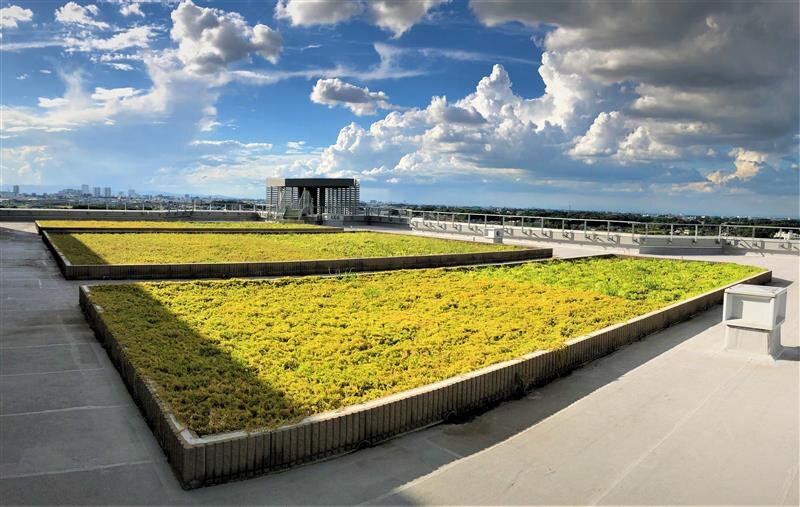 屋上に設置された雨水流出抑制型屋上緑化システム『スクエアターフ洪水無用』
