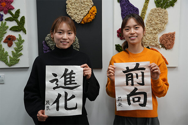 書き初め前に抱負を語り合う2人