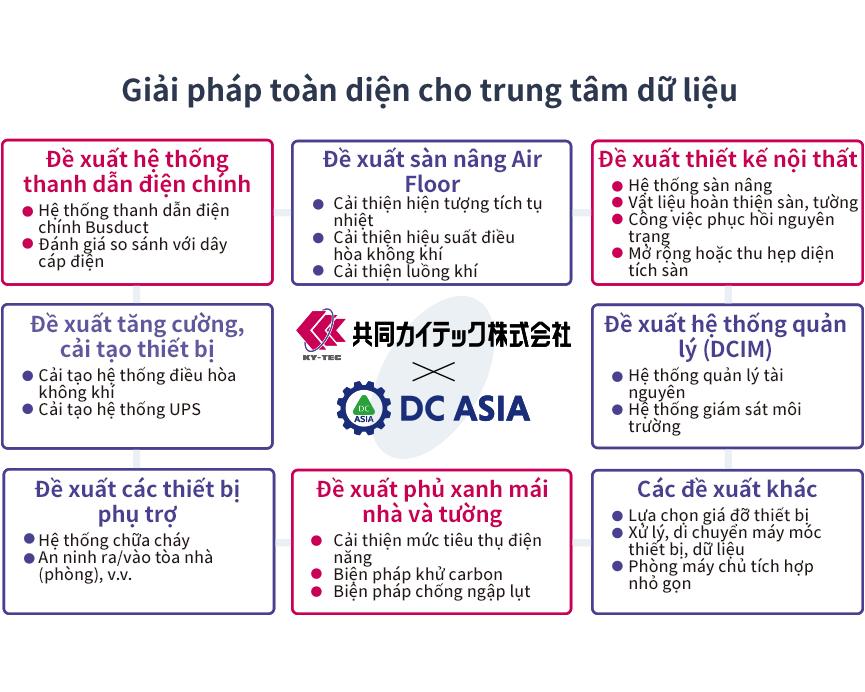Kyodo KY-TEC sẽ đề xuất những sản phẩm tốt nhất cho các trung tâm dữ liệu bằng cách sử dụng công nghệ, chất lượng và dịch vụ mà công ty đã vun đắp thông qua việc phát triển ba lĩnh vực kinh doanh: "Kinh doanh ống dẫn thanh dẫn", "kinh doanh sàn ra vào tự do" và "kinh doanh mảng xanh trên mái và tường". Bằng cách hợp tác với công ty DC ASIA, chúng tôi đang mở rộng và phát triển lĩnh vực giải pháp.